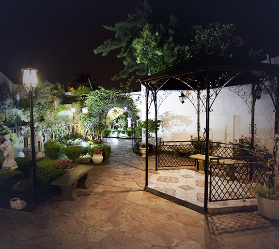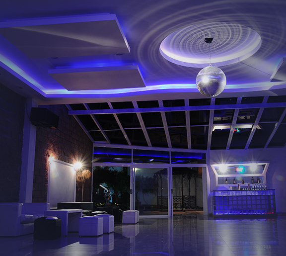 Ambientación lounge en blanco y negro de 170 m2, decorado en yeso, pisos de porcelanato, con amplia vista hacia el parque, iluminación de última generación y techo de vidrio corredizo.